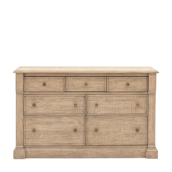 This 7 drawer chest is a charming and practical addition to any bedroom. Its weathered wood finish and classic design create a warm and inviting atmosphere. The seven spacious drawers offer ample storage space for clothing, linens, and other essentials. The dresser's sturdy construction and timeless style make it a valuable addition to any home. Material: Solid Pine Wood / Plywood Product Zone: Indoor Leg / Feet Height: 135mm Clearance to Floor: 135mm Storage: 7 Drawers Internal Drawer Size: Three Top Drawers: W377 x D324 x H112mm / Two Middle Drawers: W595 x D324 x H162mm / Two Bottom Drawers: W595 x D324 x H237mm Assembly Required: No Anti Topple Kit: Yes