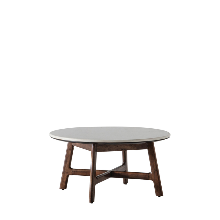 We designed this coffee table to be round as the soft rounded shape suited the mid century styling and a round coffee table gives shape to a room and creates a perfect Centre piece Material: Acacia / Marble / MDF Shape: Round Leg Finish: Walnut Stain / Matt Lacquer Leg Material: Acacia Assembly Required: Yes