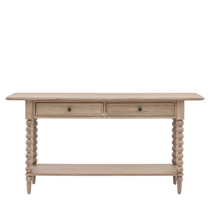 This stunning console table, with its two drawers and lower shelf for added practicality, would make a stylish addition to any interior. The play on a classic look emphasises the hand-crafted bobbin detail down each leg. This eye-catching design feature is created by turning the wood on a lathe, a task carried out by the finest craftsmen. The table is made using beautiful oak solids and veneers where practical, with a very subtle lime wash tone to the finish which is soft and mellow. Matching pieces are available. Material: Oak / Oak Veneer MDF / Plywood / Pine Leg / Feet Height: 615mm Clearance to Floor: 615mm Storage: 2 Drawers / 1 Shelf Internal Drawer Size: W555 x D240 x H150mm Distance between shelves: 444mm Anti Topple Kit: Yes