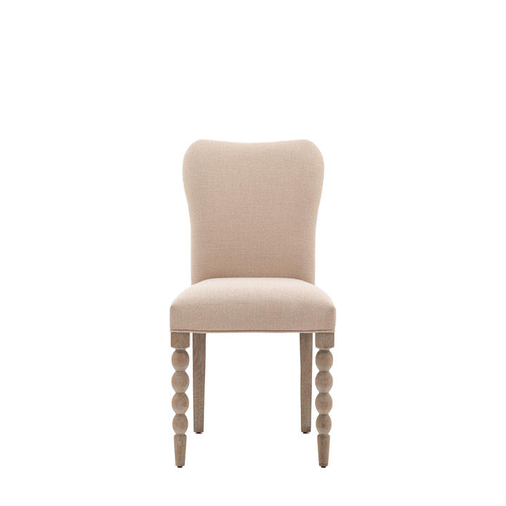 Featuring a fully upholstered seat and beautiful oak legs, these stunning dining chairs will make a classy addition to any dining room. The front legs feature hand-crafted bobbin detail which is created by turning the wood on a lathe, a task carried out by the finest craftsmen. The wood has a very subtle lime wash tone to the finish which is soft and mellow, and looks beautiful paired with biscuit coloured fabric for the upholstered seat. Matching pieces are available. Pack Of: 2 Material: Oak / Acacia / Plywood Seat Height: 480mm Seat Width between arms: 470mm Seat Depth: 410mm Leg / Feet Height: 440mm Clearance to Floor: 440mm
