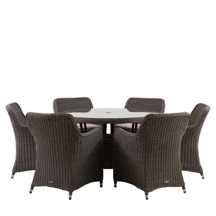 Crafted in durable PE wicker, this 4 seat dining set creates a sophisticated outdoor dining area. Each seat offers comfortable, relaxed dining, with smooth curves and armrests. The glass topped table features a practical shelf for extra storage and space for a parasol umbrella. The refreshing light grey woven PE wicker is complemented by pale, showerproof cushions, combining comfort and style. Material: Plastic Wicker / Aluminium Frame / Foam / Glass / Polyester Fabric Product Zone: Outdoor Additional Information: Cushions are shower resistant only, not waterproof, and must not be left out in the rain or wet conditions, as this will cause damage and staining due to the fire-resistant treatment applied. Cushions should be stored away when not in use. Shape - OTDR: Round Set includes - OTDR: 6 x Chairs: W640 x D610 x H880mm / 1 x Dining Table: W1280 x D1280 x H750mm Seat Height - OTDR: 500 Seat Width between arms - OTDR: 480 Seat Depth - OTDR: 480 Seats - OTDR: 6 Leg / Feet Height - OTDR: 100mm Clearance to Floor - OTDR: 100mm Pole Width: 60mm Table includes parasol hole: Yes Maximum parasol pole width: 60mm Assembly Required - OTDR: Yes - Full Assembly