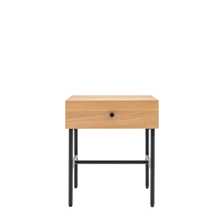 This contemporary bedside, with its practical drawer, is crafted using oak veneers paired with a black metal underframe and drawer handle. The natural wood veneer, with its unique random knots, has been selected to give a modern rustic style. Matching pieces available. Material: MDF Melamine / Iron / MDF Leg / Feet Height: 370mm Clearance to Floor: 370mm Storage: 1 Drawer Internal Drawer Size: W360 x D360 x H90mm Assembly Required: Leg / Foot Only