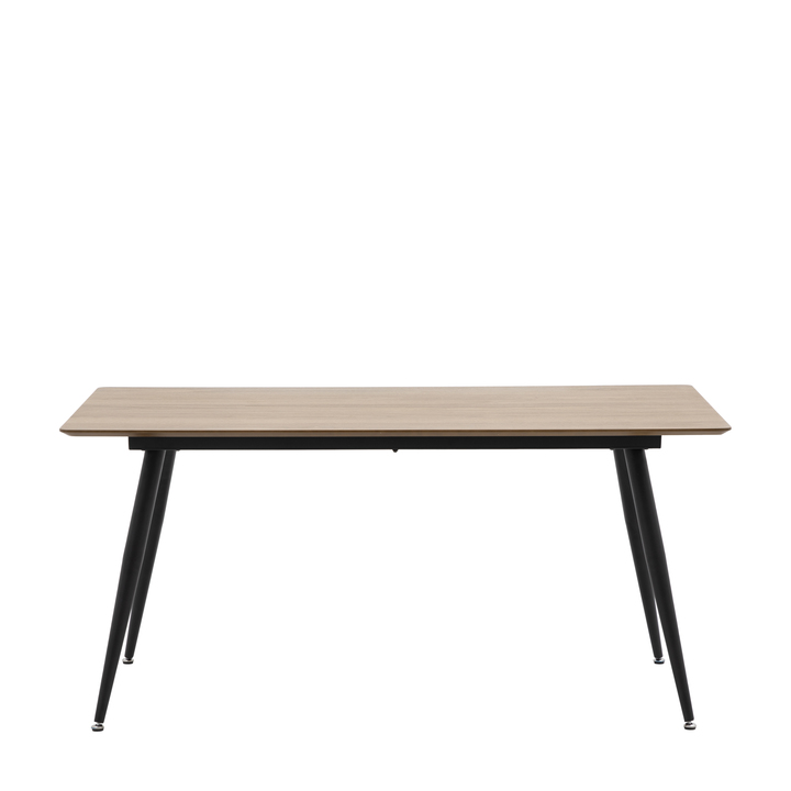 This stunning dining table offers a sleek contemporary look, combining an oak veneer top with elegant black metal legs, whilst chrome feet add the finishing design detail. It is part of our Packed-Flat Design Project which offers easy delivery to any room in any property and reduces the packaging needed. Assembly is required, but all the tools needed are supplied. \n\nThe table is part of a collection offering a selection of six dining tables, with a choice of a round or a rectangular style, each in three top finishes, black oak, natural oak, and walnut. Material: MDF / Oak Veneer / Iron Shape: Rectangle Seats - Table / Bench: 6 Assembly Required: Yes - full Anti Topple Kit: Yes