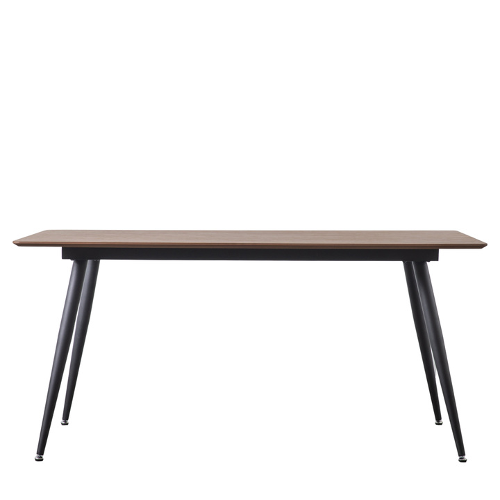 This stunning dining table offers a sleek contemporary look, combining a walnut veneer top with elegant black metal legs, whilst chrome feet add the finishing design detail. It is part of our Packed-Flat Design Project which offers easy delivery to any room in any property and reduces the packaging needed. Assembly is required, but all the tools needed are supplied. \n\nThe table is part of a collection offering a selection of six dining tables, with a choice of a round or a rectangular style, each in three top finishes, black oak, natural oak, and walnut. Material: MDF / Oak Veneer / Iron Shape: Rectangle Seats - Table / Bench: 6 Assembly Required: Yes - full Anti Topple Kit: Yes