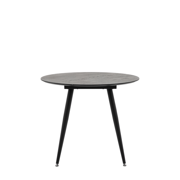 This stunning dining table offers a sleek contemporary look, combining an oak veneer top with a black finish with elegant black metal legs, whilst chrome feet add the finishing design detail. It is part of our Packed-Flat Design Project which offers easy delivery to any room in any property and reduces the packaging needed. Assembly is required, but all the tools needed are supplied. \n\nThe table is part of a collection offering a selection of six dining tables, with a choice of a round or a rectangular style, each in three top finishes, black oak, natural oak, and walnut. Material: MDF / Oak Veneer / Iron Shape: Round Seats - Table / Bench: 4 Assembly Required: Yes - full Anti Topple Kit: Yes