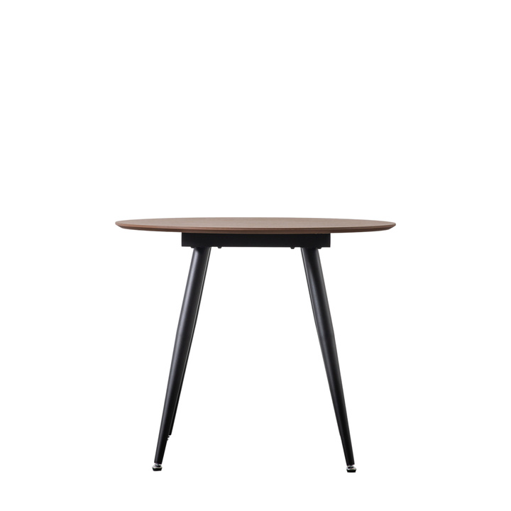 This stunning dining table offers a sleek contemporary look, combining a walnut veneer top with elegant black metal legs, whilst chrome feet add the finishing design detail. It is part of our Packed-Flat Design Project which offers easy delivery to any room in any property and reduces the packaging needed. Assembly is required, but all the tools needed are supplied. \n\nThe table is part of a collection offering a selection of six dining tables, with a choice of a round or a rectangular style, each in three top finishes, black oak, natural oak, and walnut. Material: MDF / Oak Veneer / Iron Shape: Round Seats - Table / Bench: 4 Assembly Required: Yes - full Anti Topple Kit: Yes
