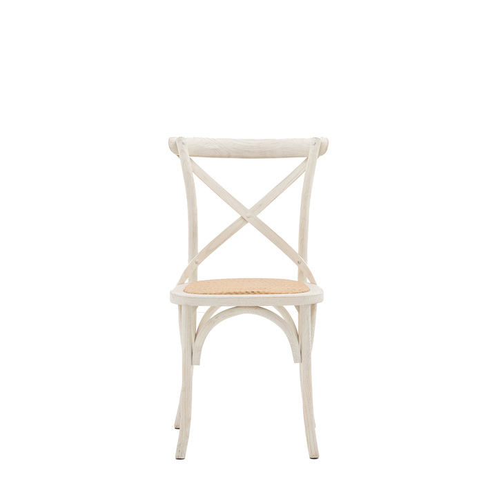 Set of 2 simple yet sophisticated cross back bistro style chairs. Bring the French cafe culture to your home with these elegant white chairs featuring solid rattan frames and hand woven rattan seats. Pack Of: 2 Material: Oak / Plywood / Rattan Product Zone: Indoor Seat Height: 480mm Seat Width between arms: 440mm Seat Depth: 420mm Leg Finish: Weathered Clearance to Floor: 480mm Assembly Required: No Anti Topple Kit: No