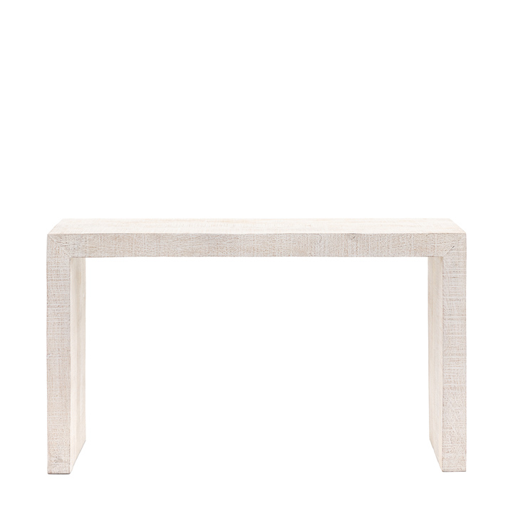 Perfect for use as a console table or slim desk this chunky rustic table will add homely charm to your room. With a simple sturdy shape, this table is made with rough hewn Mango wood in a whitewash finish for a charmingly rustic feel. Also available in a natural finish. Coordinating additional pieces available. Material: Mango Wood / Mango Wood Veneer Leg / Feet Height: 725mm Clearance to Floor: 725mm Anti Topple Kit: Yes