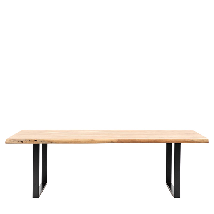 This lovely dining table features a solid acacia top with a live edge, paired with a black metal ‘U’ shaped underframe which gives a modern semi-industrial look, ideal for any eclectic interior. It looks perfect paired with the matching dining bench. A smaller table is also available. Material: Acacia / Iron Shape: Rectangle Seats - Table / Bench: 8 Leg / Feet Height: 710mm Clearance to Floor: 710mm Assembly Required: Leg / Foot Only Additional Information: Natural Acacia wood crafted products may darken or develop a warmer, reddish tone over time due to a combination of natural properties of the wood and external environmental factors