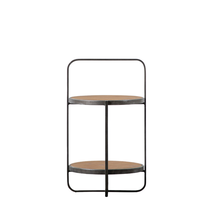 Contemporary side table crafted from metal with an antique pewter finish combined with a fir veneer top and shelf with a natural finish with a light wash to highlight the grain of the wood. The unusual design features a continuation of one section of the base, up and over the tables to create a 'handle' effect.  Material: Iron / MDF / Chinese Fir Veneer Adjustable Shelves: No Distance between shelves: 338mm Assembly Required: Yes - top only Additional Information: Dimensions are the size of the table top