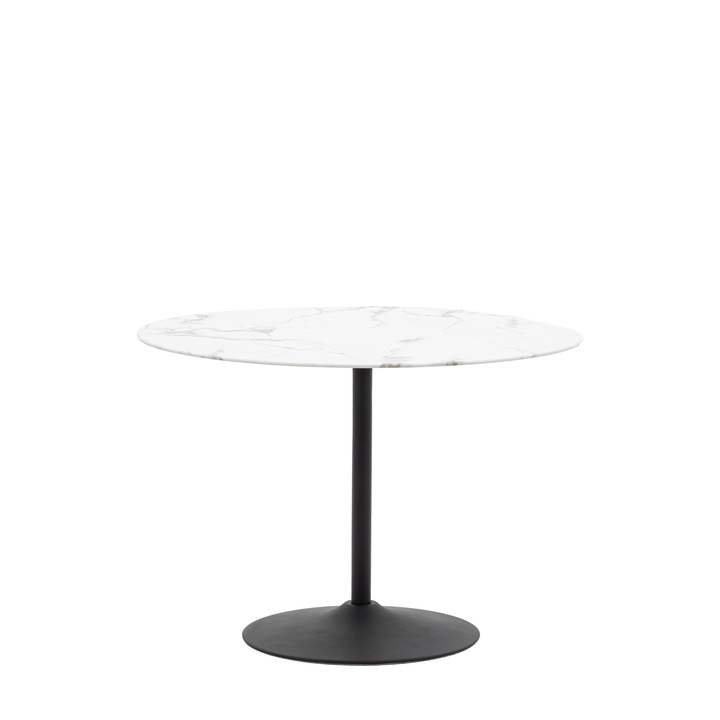 With a sophisticated round faux white marble glass top and smoothly curved dark chrome base, this table is stunningly modern. Seating 4 people, it is great for a smaller space where style is still essential. Material: Iron / Glass Seats - Table / Bench: 4 Leg Material: Iron Clearance to Floor: 740mm Assembly Required: Yes - legs / feet only