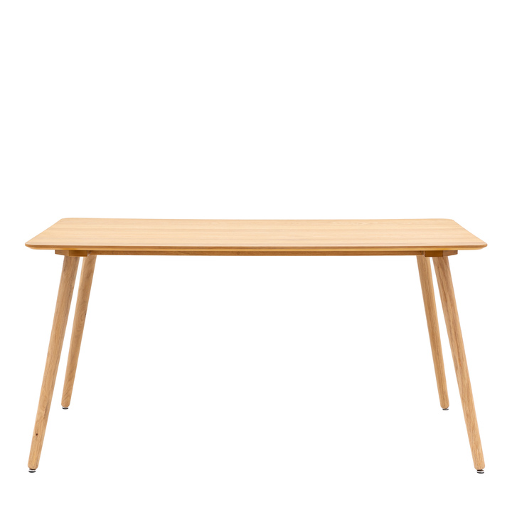 Offering retro style with a contemporary touch, this beautiful dining table features gently rounded corners which pair perfectly with the elegant legs. It is crafted from oak veneers and rubberwood with a natural finish. The table is also available in a smoked oak finish, and matching pieces are available. Material: Oak Veneer / MDF / Oak / Rubber Wood Shape: Rectangle Seats - Table / Bench: 6 Leg / Feet Height: 753mm Clearance to Floor: 753mm Assembly Required: Leg / Foot Only
