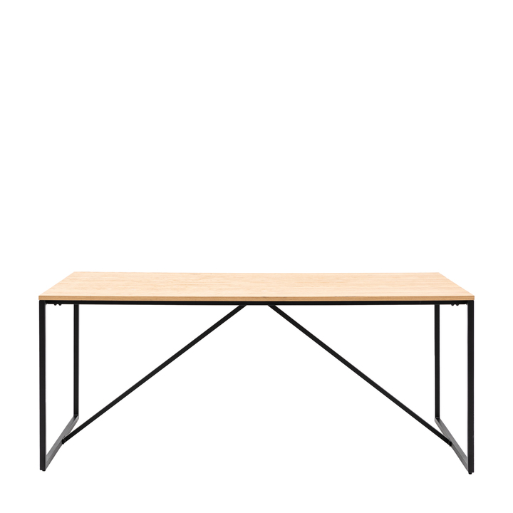 This stunning dining table combines clean sharp lines with a natural oak veneer top and a matt black metal base to offer crisp contemporary style. It is part of a collection which offers a range of tables plus a display unit.\n\nThe collection is part of our Packed-Flat Design Project, offering easy delivery to any room in any property, whilst reducing the packaging needed. Easy assembly is required, but all the tools needed are supplied. Material: MDF / Oak Veneer / Iron Seats - Table / Bench: 8 Assembly Required: Yes - full Anti Topple Kit: Yes