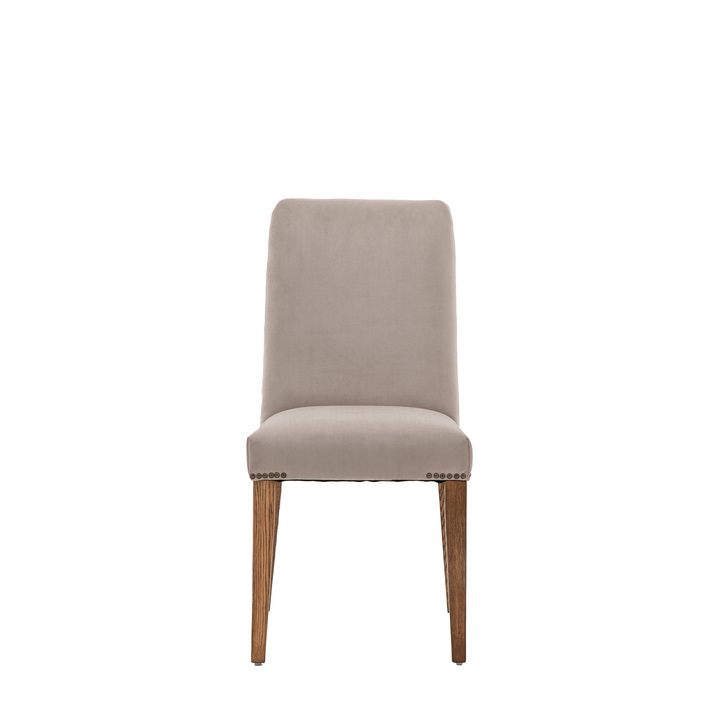 Set of 2 dining chairs perfectly suited to both modern and traditional interiors. The seat and back are upholstered in a luxurious taupe velvet, with metal detailing, which pairs perfectly with the rich tonal Mindy wood finish legs. Pack Of: 2 Material: Oak / Plywood / Polyester / Foam / Brass Studs Product Zone: Indoor Seat Height: 490mm Seat Width between arms: 460mm Seat Depth: 440mm Leg Finish: Weathered Clearance to Floor: 490mm Assembly Required: Leg / Foot Only Anti Topple Kit: No