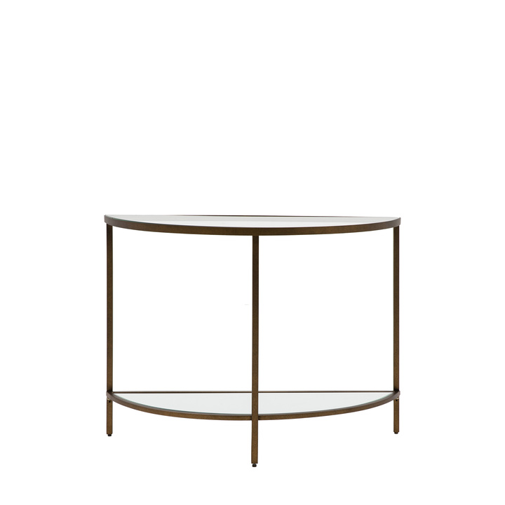 Glamorous and eye catching Demi Lune shaped Console Table perfect for hallways, living rooms and bedrooms alike. The tempered glass top shelf & mirror glass bottom shelf in a vintage bronze metal frame will add a touch of luxury to any room. Material: Metal / Glass / MDF Product Zone: Indoor Shape: Rectangle Leg Finish: Aged Gold Leaf Clearance to Floor: 135mm Adjustable Shelves: No Distance between shelves: 575mm Assembly Required: Yes - full Anti Topple Kit: Yes