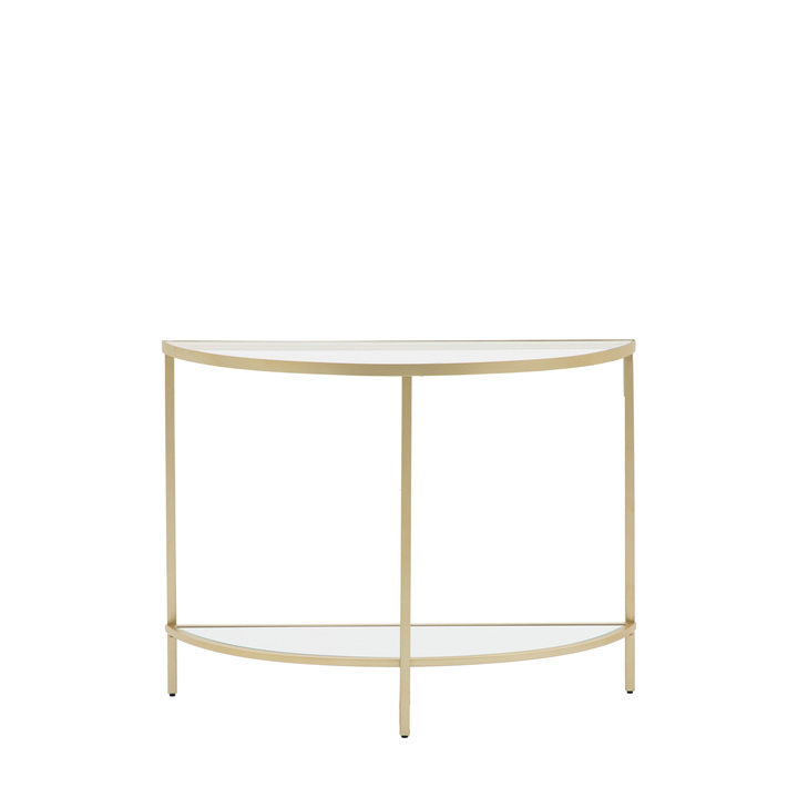 Glamorous and eye catching Demi Lune shaped Console Table perfect for hallways, living rooms and bedrooms alike. The tempered glass top shelf & mirror glass bottom shelf in a champagne metal frame will add a touch of luxury to any room. Material: Metal / Glass / MDF Product Zone: Indoor Shape: Rectangle Leg Finish: Powder Coated Clearance to Floor: 135mm Adjustable Shelves: No Distance between shelves: 575mm Assembly Required: Yes - full Anti Topple Kit: Yes