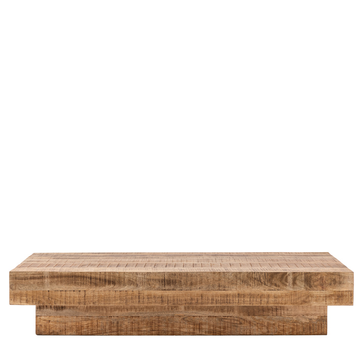 Add a contemporary rustic touch to a room with this coffee table. The piece is cleverly designed to look like solid blocks of cross-sawn timber, but is actually produced using architectural veneers for stability and practicality. The dry weathered finish enhances the design. Material: Mango Wood Assembly Required: No
