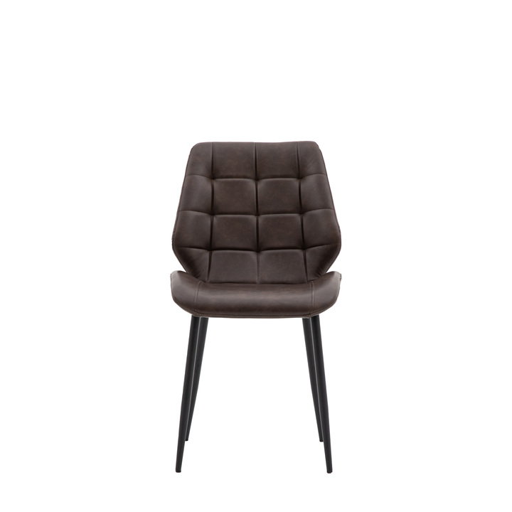 Set of 2 Mid-Century inspired modern dining chairs. These versatile chairs will make a stand out addition to your dining space or home office. The shaped chair back and curved seat are upholstered in brown with extra stitch detailing for a modern look. Pack Of: 2 Material: Iron / PU / Plywood / Foam Seat Height: 510mm Seat Width between arms: 485mm Seat Depth: 405mm Leg Material: Iron Clearance to Floor: 370mm Assembly Required: Yes - legs / feet only