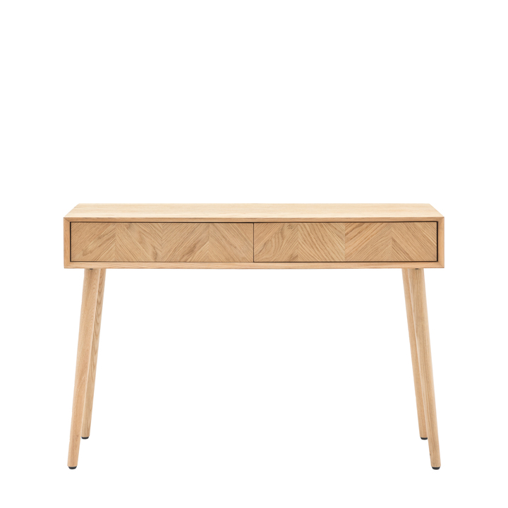 This stunning 2 drawer console table features a beautiful inlay chevron design, and is made using European oak and rustic oak structured veneers which show the natural beauty of the oak grain and knots. Finished in a specialist mat lacquer, which keeps the timber looking natural and dry, with brushed out grain, the table is tactile to the touch and looks amazing. It has 2 drawers for added practicality. The console table can also be used as a dressing table, and looks great with the coordinating mirror above it. Material: Oak / Oak Veneer / MDF Storage: 2 Drawers Internal Drawer Size: 529x260x86 (2) Assembly Required: Leg / Foot Only