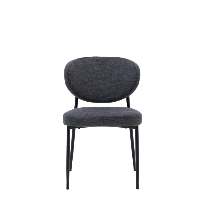 This dining chair is a stylish and comfortable addition to any dining space. Its unique oval-shaped backrest and sleek black metal legs create a modern and eye-catching look. The soft, upholstered seat provides comfort and style, while the dark grey fabric adds a touch of sophistication. Pack Of: 2 Material: Foam / Iron / Polyester Product Zone: Indoor Seat Height: 480mm Seat Width between arms: 480mm Seat Depth: 460mm Clearance to Floor: 410mm Assembly Required: Yes - Legs / Feet Only