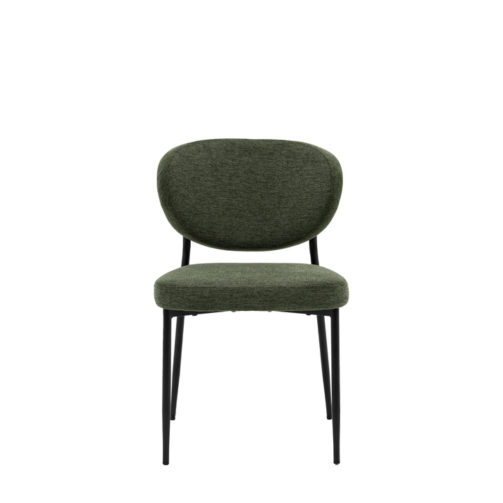 This dining chair is a stylish and comfortable addition to any dining space. Its unique oval-shaped backrest and sleek black metal legs create a modern and eye-catching look. The soft, upholstered seat provides comfort and style, while the green fabric adds a touch of sophistication. Pack Of: 2 Material: Foam / Iron / Polyester Product Zone: Indoor Seat Height: 480mm Seat Width between arms: 480mm Seat Depth: 460mm Clearance to Floor: 410mm Assembly Required: Yes - Legs / Feet Only