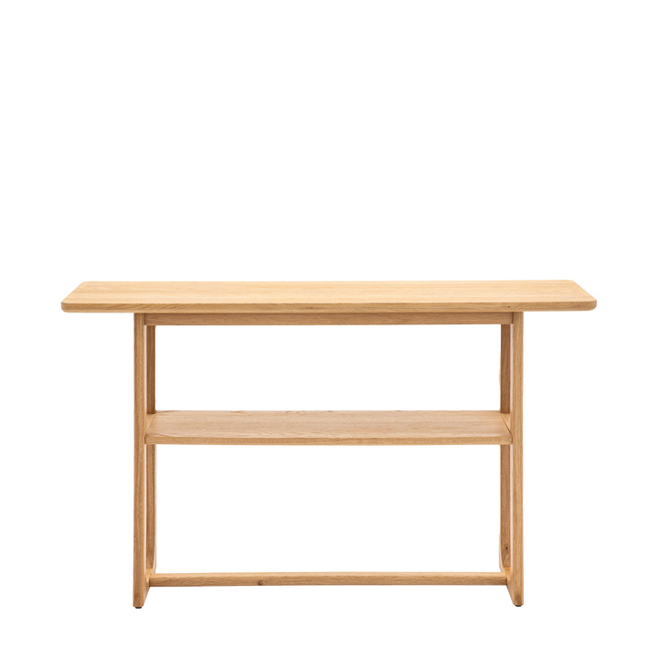 Crafted from the finest oak and structural oak veneers where practical, this beautiful console table would suit a wide range of interiors. The elegant underframe offers structural stability combined with style and the shelf adds extra practicality to the table. The wood has a lovely natural finish. The table is also available in a smoked finish, and matching pieces are available. Material: Oak / Oak Veneered MDF Leg / Feet Height: 770mm Clearance to Floor: 770mm Distance between shelves: 385 / 291mm Assembly Required: Leg / Foot Only Anti Topple Kit: Yes