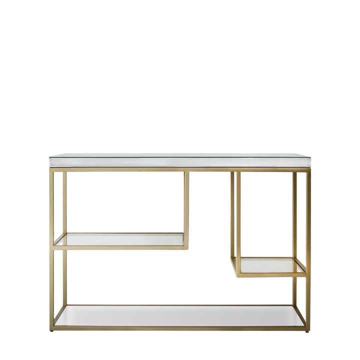 Create a focal point with this stylish yet practical designer console table, featuring a bevelled mirror top and tempered mirrored shelves set into a modern, soft champagne coloured metal frame. Material: Glass / MDF / Metal Additional Information: Clear glass shelves