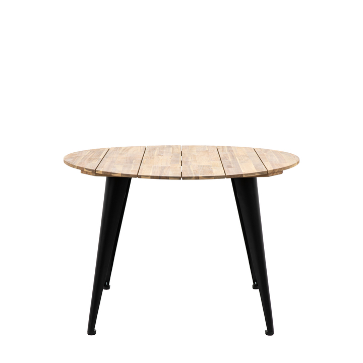 Add a modern industrial look to your outdoor space with this round dining table. Featuring a Acacia wood top with a natural finish and contrasting industrial style dark powder coated metal legs, this dining table will make a style statement, perfect for a modern urban garden. Coordinating chairs also available. Material: Acacia / Iron Product Zone: Outdoor Shape - OTDR: Round Seats - OTDR: 4 Clearance to Floor - OTDR: 710mm Hanging Orientation - OTDR Mirror: Hanging and Stand Fixing Type - OTDR Mirrors: Decorative Metal Chain Assembly Required - OTDR: Yes - Legs / Feet Only