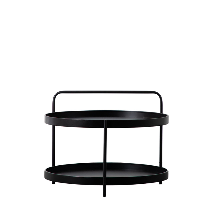 Contemporary coffee table crafted from metal with a black finish, with a tray-style top and lower shelf. The stunning design features a continuation of one section of the base, up and over the table to create a ‘handle’ effect. A matching side table is available and both are also offered in a gold leaf finish. Material: Iron Adjustable Shelves: No Distance between shelves: 280mm Assembly Required: Yes - top only Additional Information: Dimensions are the size of the table top