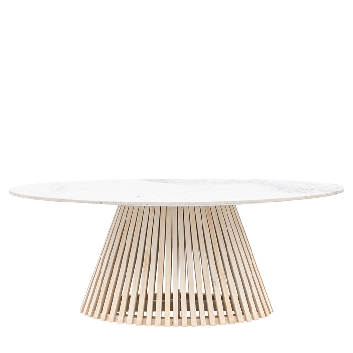 Offering stylish contemporary design, this beautiful oval dining table has a stunning white Indian marble top which is paired with a stunning base to create an elegant, classy table. The base is crafted from gently sloping slats of mango solid timbers with a white-washed, sand-blasted finish, creating a striking design feature. Matching items are available. Material: Marble / Mango Wood Shape: Oval Seats - Table / Bench: 6 Leg / Feet Height: 755mm Clearance to Floor: 755mm Assembly Required: Yes - top only