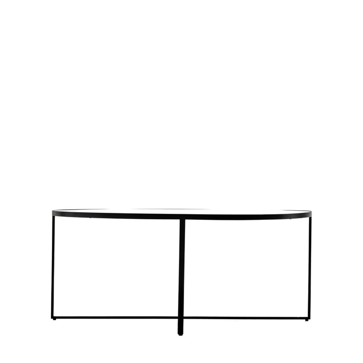 Make a statement with this trendy coffee table featuring a contemporary smoked grey glass top set in a matt black metal frame with stylish cross frame detailing for strength and stability. Material: Glass / MDF / Metal Additional Information: Smoked mirrored top