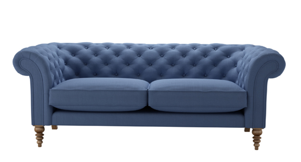 The Chesterfield gets a leggy new look. back cushions: see website color: blue covers: see website seat cushions: see website size: Three Seat Sofa