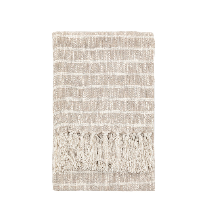 Soft and warm this cosy striped throw in sand & white is woven with comfort and finished off with 4 soft tassels. Perfect for adding a cosy feel to any room. Material: Polyester Product Zone: Indoor Fabric Weight: 300 GSM Technique: Woven Care Instructions - Textiles: Hand Wash Only / Do Not Bleach / Do Not Tumble Dry / Do Not Iron / Do Not Dry Clean / Wash Dark Colours Separately