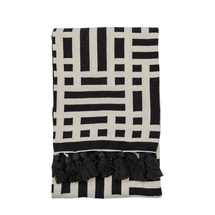 A Stylish Knitted throw with a contemporary black and cream design and finished with charming black tassels. Material: Cotton Fabric Weight: 970 gsm Technique: Knitted Care Instructions - Textiles: Spot Clean Only / Do Not Bleach / Do Not Tumble Dry / Do Not Iron / Do Not Dry Clean