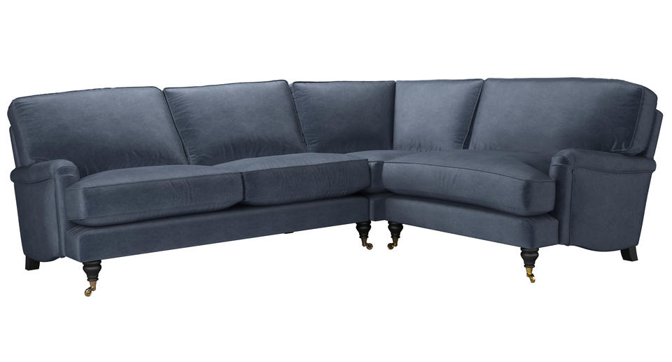A classic design and one of our most popular sofas. back cushions: feather and fibre color: Blue, Grey covers: fixed seat cushions: feather wrapped foam size: Left Hand 2.5 Seat With Right Hand Loveseat