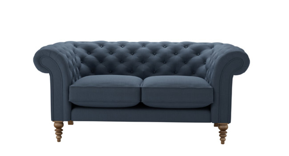The Chesterfield gets a leggy new look. back cushions: see website color: blue covers: see website seat cushions: see website size: Two Seat Sofa