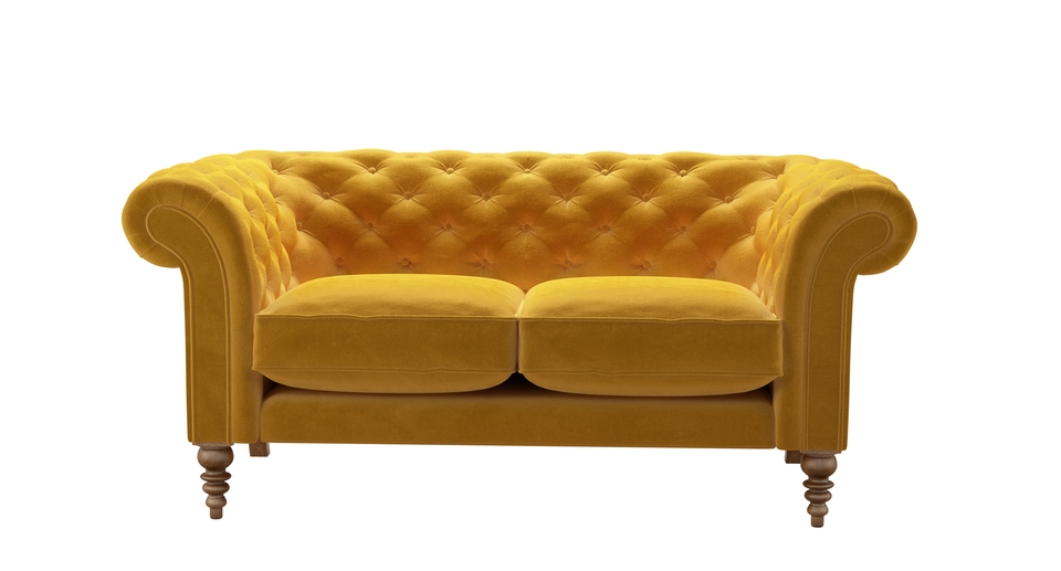 The Chesterfield gets a leggy new look. back cushions: see website color: yellow covers: see website seat cushions: see website size: Two Seat Sofa