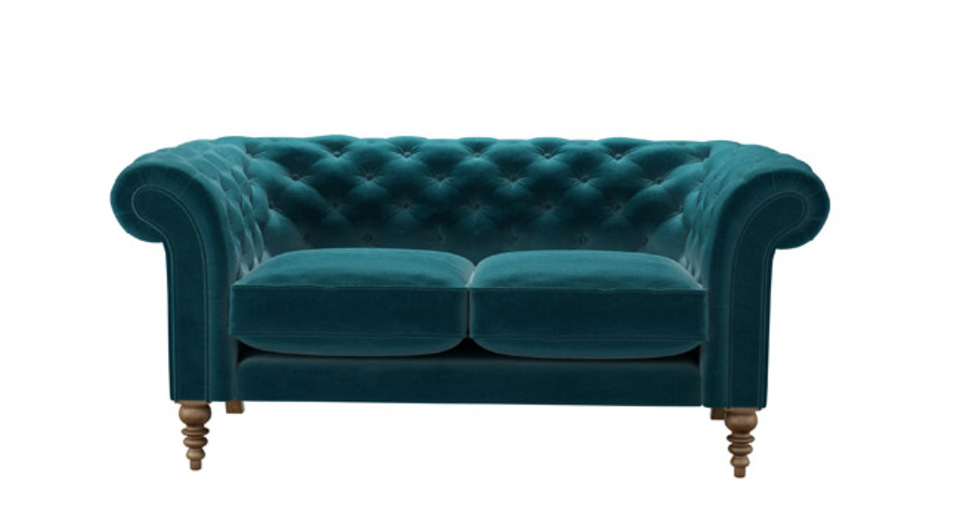 The Chesterfield gets a leggy new look. back cushions: see website color: green,blue covers: see website seat cushions: see website size: Two Seat Sofa