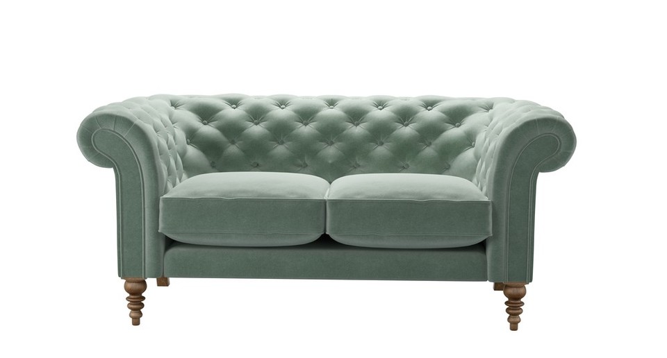 The Chesterfield gets a leggy new look. back cushions: see website color: green covers: see website seat cushions: see website size: Two Seat Sofa
