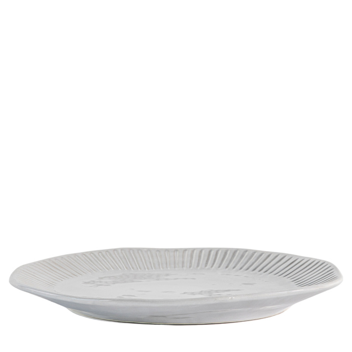 Set of four dinner plates which are our exclusive own design, featuring an organic shape and textured ridge detailing around the rim. Coordinating pieces available. Pack Of: 4 Material: Porcelain Additional Information: Dishwasher Safe / Not Microwave Safe