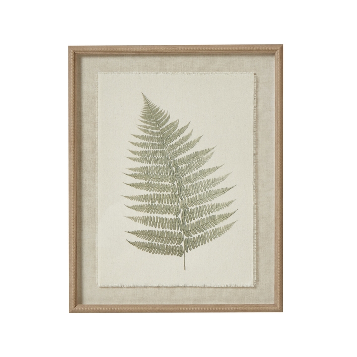 This exquisite botanical print showcases a delicately preserved bracken fern, artfully presented against a textured, torn paper background. The piece is housed in a sophisticated beaded frame that adds a subtle shimmer and refined detail to the overall composition. Perfect for both contemporary and classic interiors, this versatile artwork resonates particularly well with natural, Scandinavian, and modern rustic design schemes. The neutral palette and organic subject matter make it an excellent choice for creating serene focal points in bedrooms, studies, or living spaces. Consider displaying this piece as part of a curated gallery wall with other botanical prints, or pair it with weathered woods, natural linens, and earthy ceramics to create a cohesive nature-inspired aesthetic. The understated elegance of this framed fern print appeals to customers seeking sophisticated yet approachable wall art that bridges the gap between traditional botanical illustration and modern minimalist design. Stock alongside complementary pieces featuring pressed flowers, leaves, or other natural specimens to create an engaging retail display that appeals to design-conscious consumers looking to bring elements of the outdoors into their homes.