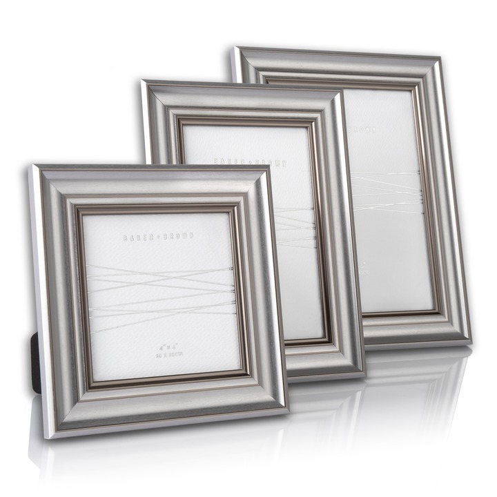 A simple silver metallic frame with a chrome highlight pivoting across the profile edges. The metallic feature rolls into the inner lip, creating a striking design. A grey velvet window opening back completes the overall aesthetic. The versatile style is available in two additional sizes: 4" x 4" and 6" x 4". Pack Of: 3 Material: Plastic / Paper / MDF Additional Information: Brushed silver with pewter highlights on highpoints and sides. Grey velvet window open back.