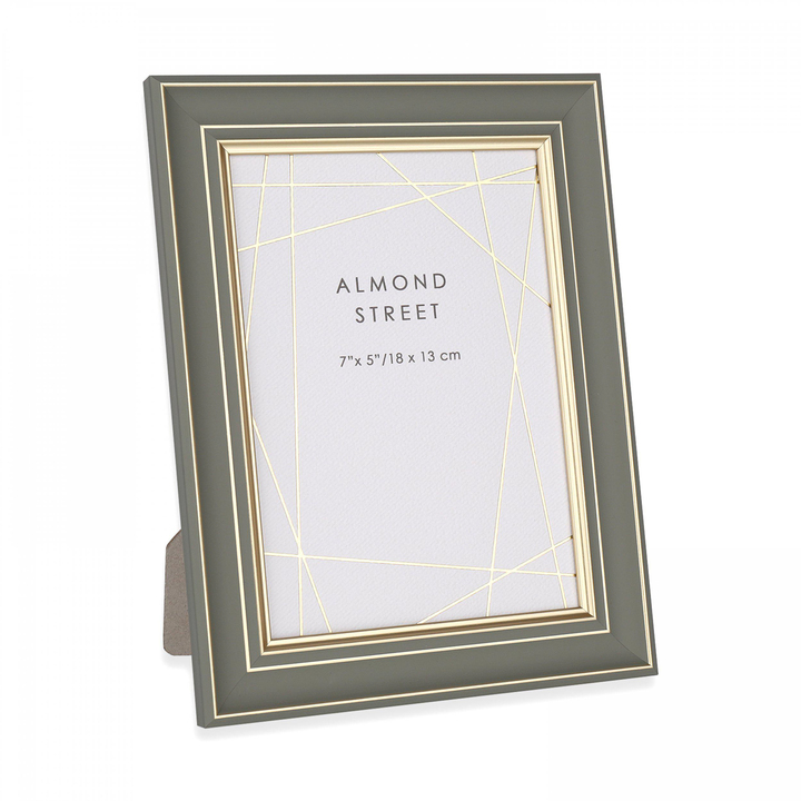 A simple sage green photo frame invites gold edging to highlight the beautiful profile that runs seamlessly around the design. The metallic feature rolls into the inner lip, creating a regal finish. The photo frame has a grey velvet window opening at the back to complete the overall aesthetic. The versatile style is available in three sizes: 6" x 4" and 4" x 4". Pack Of: 3 Material: Plastic / Paper / MDF Additional Information: Navy with gold highlights on highpoints and sides. Grey velvet window open back.