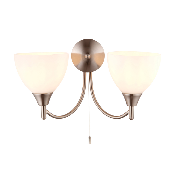 A twin wall light with a satin chrome and opal glass finish; both dimmable and suitable for use with LED lamps. Matching items available in this range, and it also comes in antique brass Material: Glass / Steel Product Zone: Indoor Bulb Included: No Bulb Type: 2 x 60W E14 golf Product Lumens: 650 Lumens Per Watt: 11 Switch Type: Pull Cord Switch Dimmable: Dimmable Voltage: 220-240V Class: Class 1 IP Rating: 20