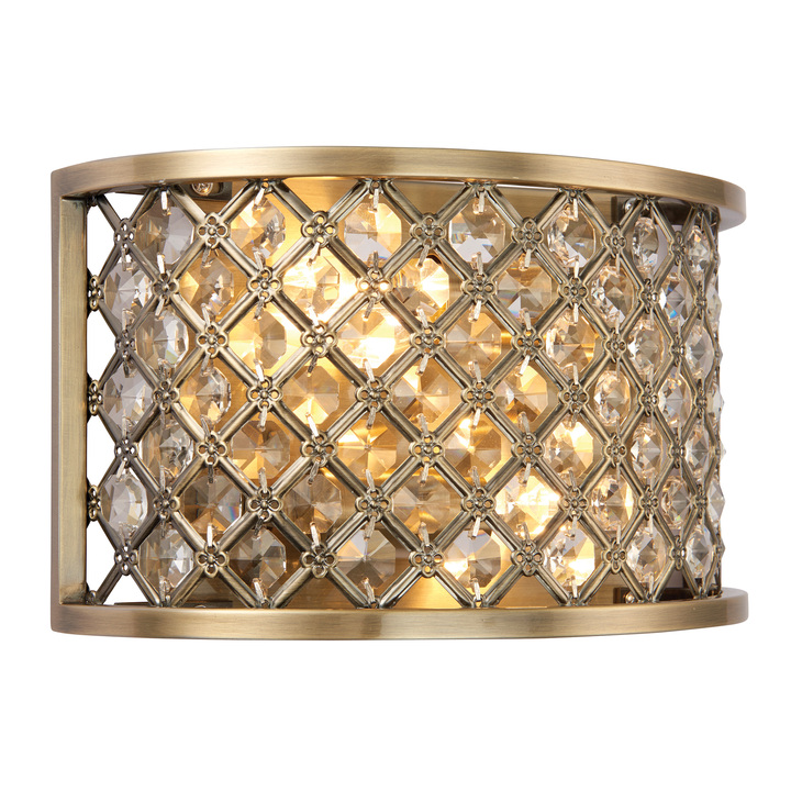 A 2 light wall fitting made of crystal beads which sit inside the steel frame, all in an antique brass finish. Dimmable and suitable for use with LED lamps. Matching items and other finish options available Material: Crystal Glass / Steel Product Zone: Indoor Bulb Included: No Bulb Type: 2 x 60W E14 golf Product Lumens: 650 Lumens Per Watt: 11 Dimmable: Dimmable Voltage: 220-240V Class: Class 1 IP Rating: 20