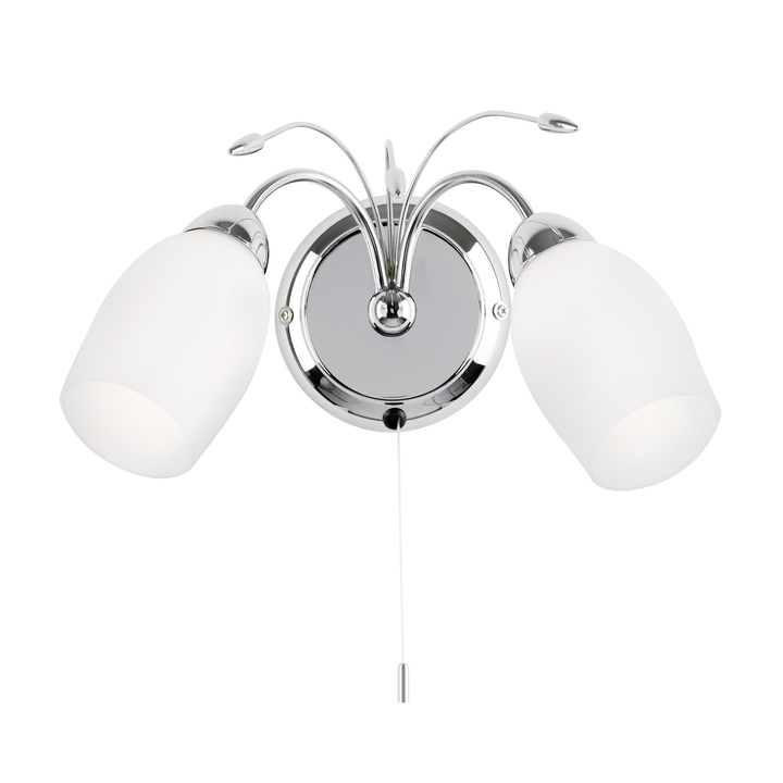 Twin wall light with down-facing opal glass shades, and finished in chrome effect plate. Supplied with pull cord switch. Dimmable and suitable for use with LED lamps. Matching items and other colour options available Material: Glass / Steel Product Zone: Indoor Bulb Included: No Bulb Type: 2 x 40W E14 candle Product Lumens: 400 Lumens Per Watt: 10 Switch Type: Pull Cord Switch Dimmable: Dimmable Voltage: 220-240V Class: Class 1 IP Rating: 20