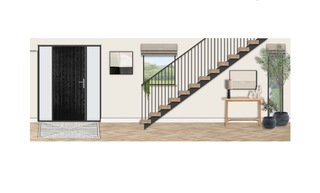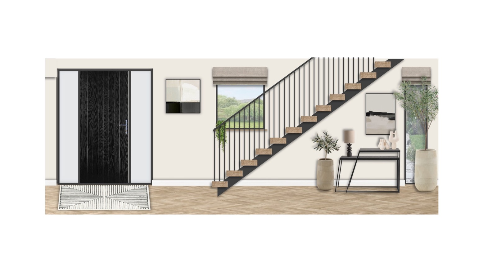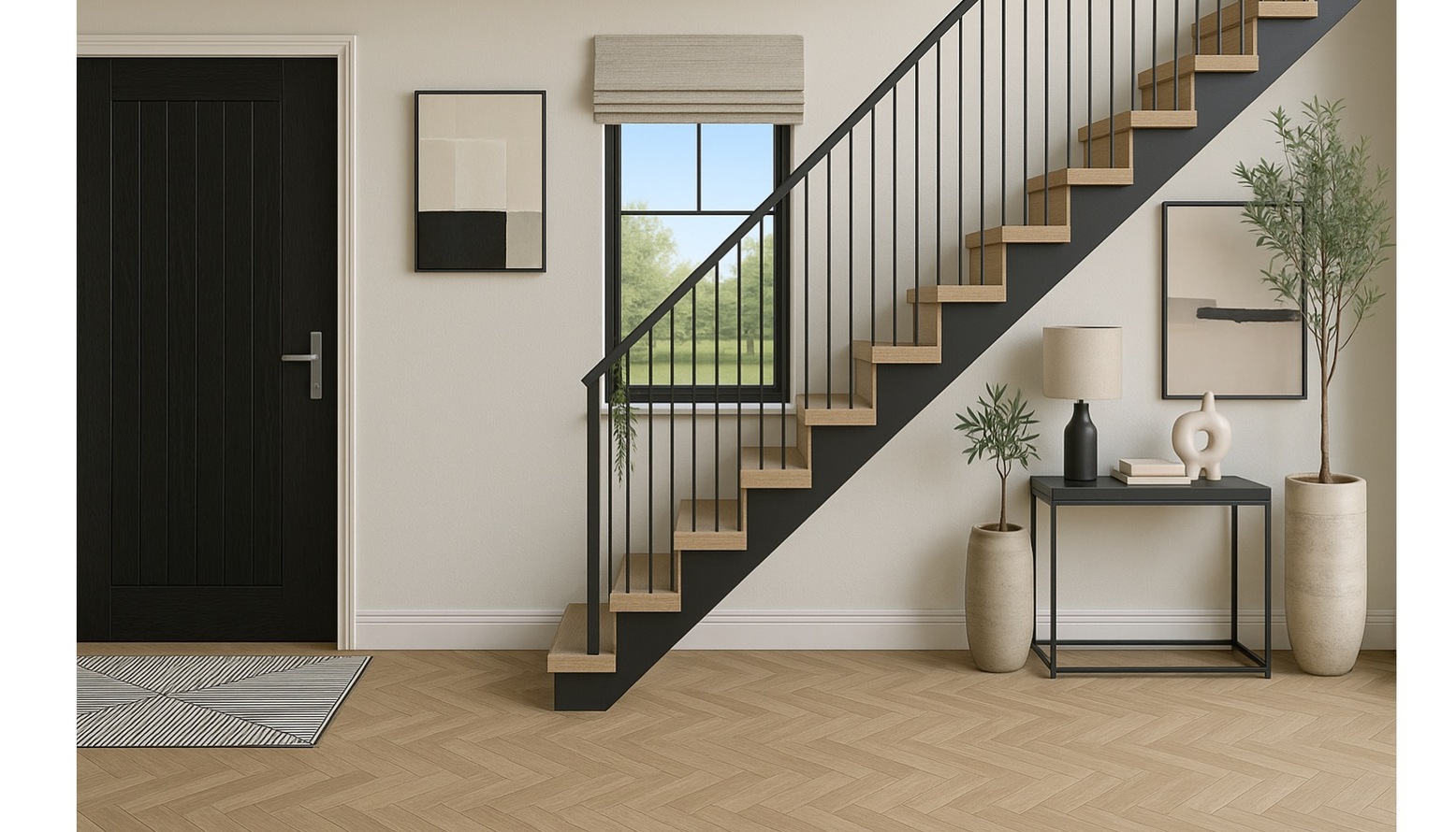 The staircase, adorned with wooden steps and a black rail, adds an element of sophistication and continuity to the design. The light filtering through the window complements the inviting atmosphere, ensuring this hallway is both functional and aesthetically pleasing.