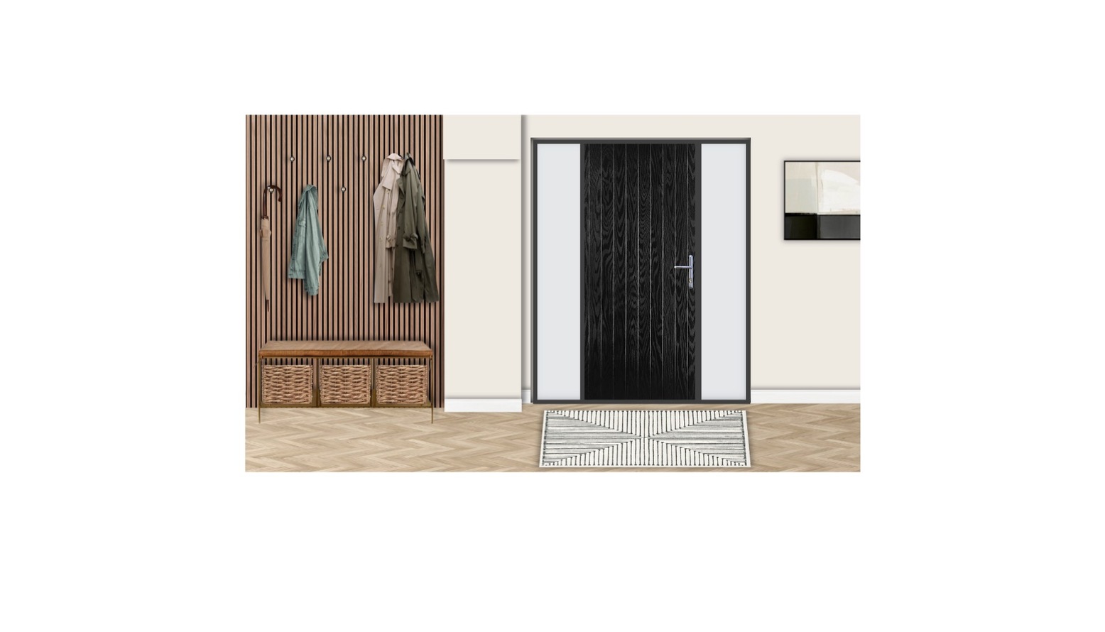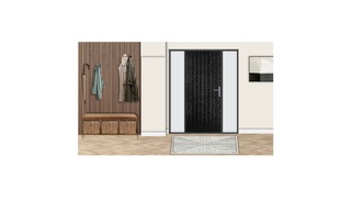 The hallway exudes a welcoming ambiance with its refined design. Featuring a distinctive black ash veneer and black metal console table, it serves as an inviting focal point. Above, a dark circular mirror adds depth and style, while a contemporary artwork piece in muted colors complements the overall aesthetic. The flooring consists of beautiful herringbone-patterned wood, contributing warmth and texture to the space. A sleek black door adds a modern touch, contrasting beautifully with the soft beige walls.