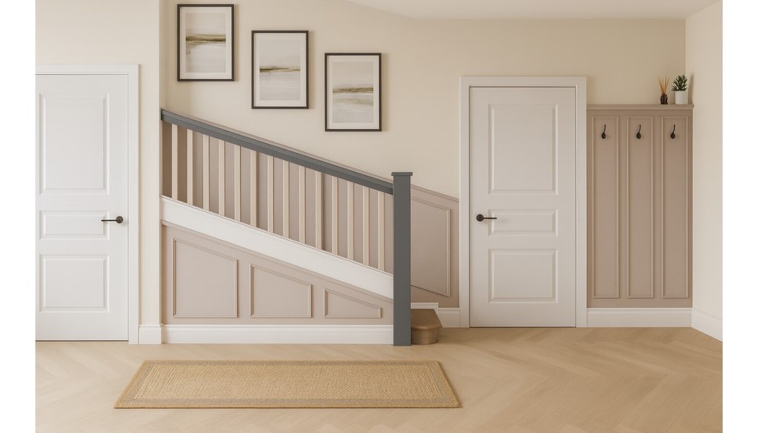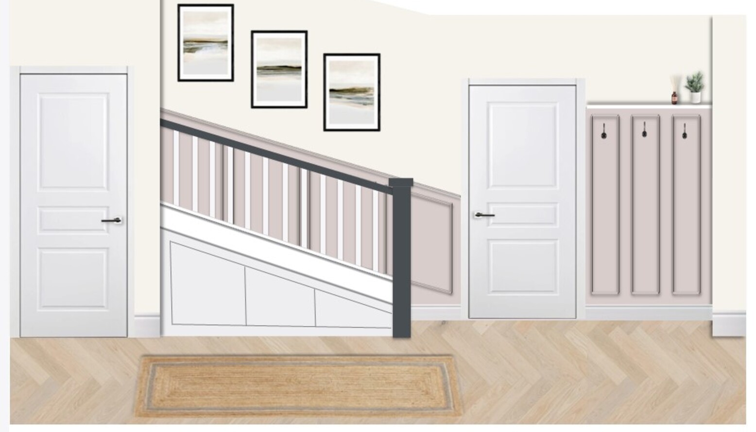 The flooring features a stunning herringbone wood design in a warm natural tone, contributing to the inviting atmosphere. A natural jute runner rug lays down the center, offering both comfort and a touch of earthy texture.