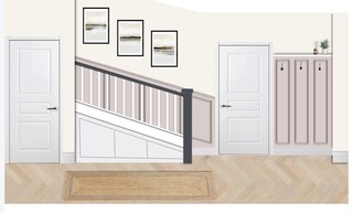 Overall, the design combines modern elements with classic touches, creating a harmonious and welcoming entrance to the home.